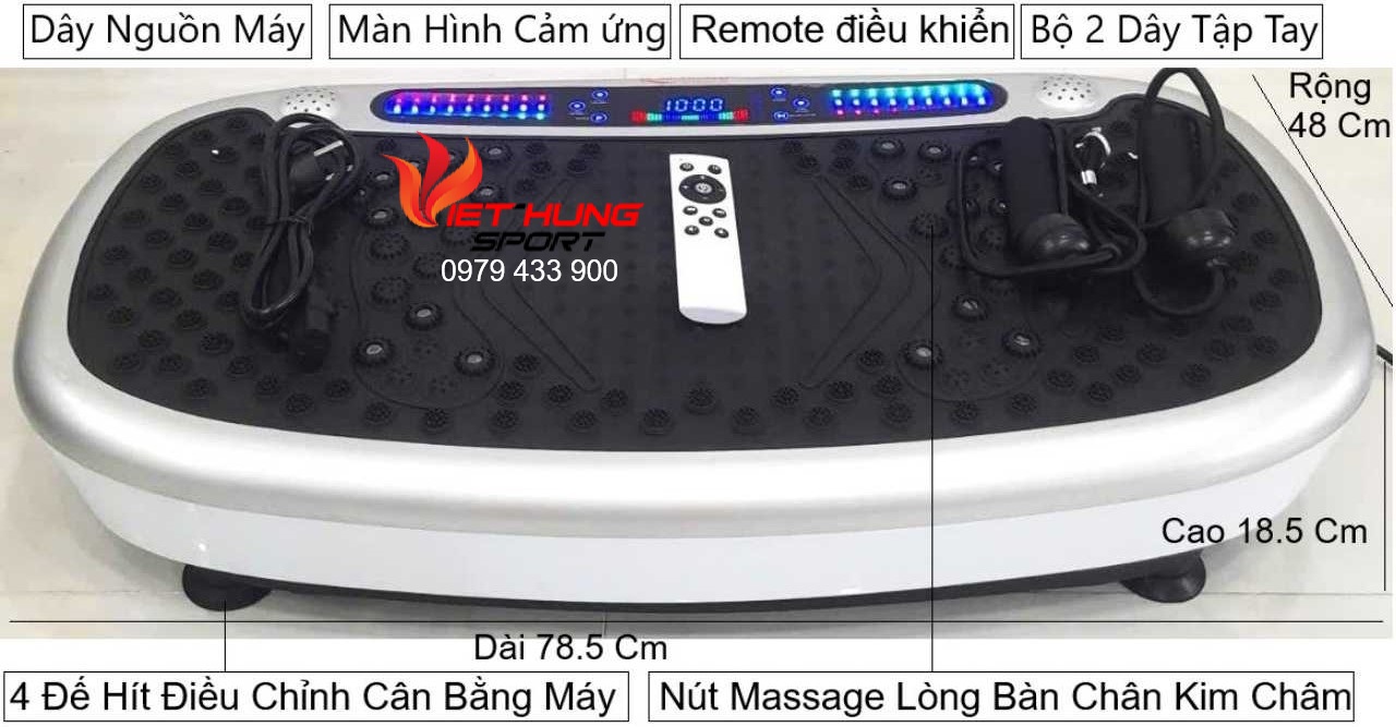 Cài đặt thời gian hẹn giờ. Tốc độ quãng đường lượng tiêu hao calori. 4 Chế độ rung tự động chế độ rung tự chỉnh từ 1 đến 399 tốc độ rung mạnh mẽ. Máy kết hợp bộ 2 dây tập tay giúp tập luyện cơ tay săn chắc thon nhỏ.