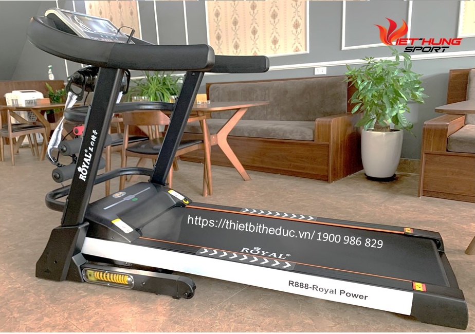 Máy chạy bộ Royal- R888: Thiết kế kiểu dáng tích hợp cho cả gia đình và phòng tập tầm chung.Với bộ khung sườn chắc chắn, động cơ mạnh mẽ lên đến 4.5 HP. Tốc độ đạt đỉnh lên đến 18 km/h, chế độ nâng dốc tự động 15%. Giúp máy hoạt động mạnh mẽ hơn, bền bỉ hơn.
